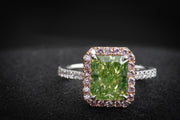 One piece of over 3 carat , magnificent radiant cut Natural Fancy Intense Yellow Green Diamond . Set with 22 pieces of round brilliant cut pink diamond .